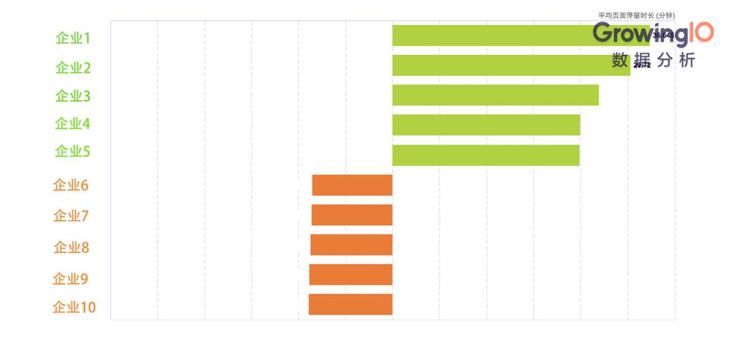 上面的双向条形图展示了某B端产品的客户平均停留时长极端情况(非常高和非常低),企业1-5非常活跃,可以让运营人员促进客户增购、续约,而企业6-10活跃度非常低,即将流失,需要运营人员立刻介入干预。