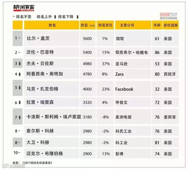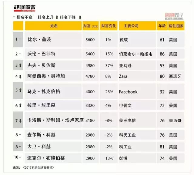 北京时间2017年3月7日,胡润研究院发布《2017胡润全球富豪榜》(Hurun Global Rich List 2017)。上榜富豪的财富计算截止日期为2017年1月15日,共计来自68个国家,1811家企业的2257位十亿美金富豪上榜,达历史最高。