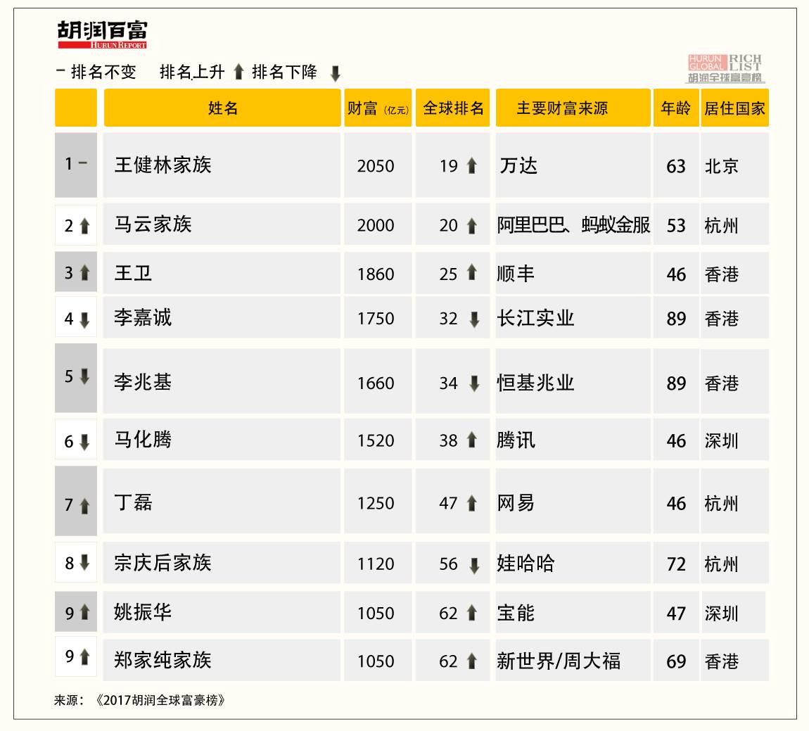 2017胡润富豪榜显示,马云家族以2000亿元的财富身价名列中国富豪榜第二名,在全球富豪榜排名第20名,比去年上升16位。