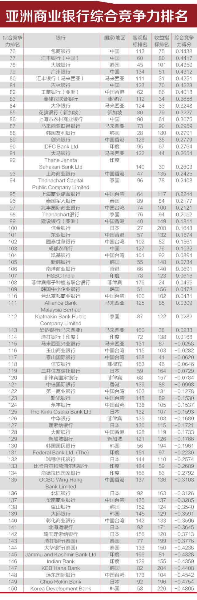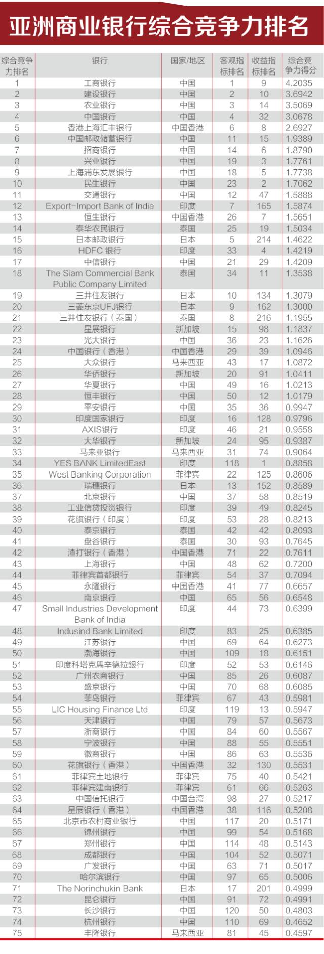 其中,中国工商银行保持了综合竞争力、客观指标两项第1名的位置,收益指标位于第9位;中国建设银行综合竞争力第2名,客观指标第2名,收益指标排名上升到第10位;中国农业银行综合竞争力第3名,客观指标第3名,收益指标上升到14名。香港上海汇丰银行综合竞争力排名第5名,客观指标排名第6名,收益指标排名第8名;中国邮储银行综合竞争力排名第6位,客观指标排名第11名,收益指标排名第15名;招商银行综合竞争力排名第7名,客观指标排名第14名,收益指标排名第6名。收益指标排名第一的银行为印度的 YES BANK Limited,其综合排名位列亚洲第34位。