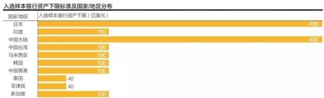 中国内地银行首次占据了亚洲排名前四位。另外,进入前15名的银行还包括2家中国香港的银行、1家日本的银行、1家泰国的银行、1家印度的银行。