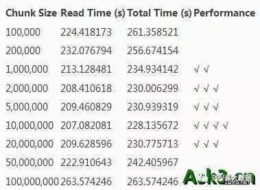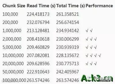 使用不同分块大小来读取再调用 pandas.concat 连接DataFrame,chunkSize设置在1000万条左右速度优化比较明显