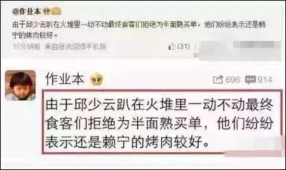 2013年5月22日,微博@“作业本”在微博发文称:“由于邱少云趴在火堆里一动不动最终食客们拒绝为半面熟买单,他们纷纷表示还是赖宁的烤肉较好”。