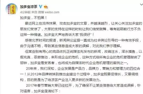 另一方面是加多宝接二连三地出面解释澄清,发表声明称“所谓的产量下降和工厂停产纯属无稽之谈,一些不实的传闻猜测绝无可能。目前公司高管全部在岗,无一离职。”