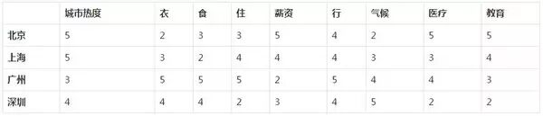 我把上面罗列的因素给各个城市进行了打分,满分5分。
