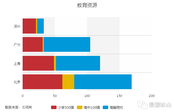 我根据互联网上发布的全国小学 500 强,中学 100 强的名单以及高等院校的分布情况,统计出北上广深的教育资源分布情况。可以看到,北京集中了最多的优秀教育资源,皇城根下的人们好生让人羡慕,深圳则再次垫底,傲娇的房价,薄弱的民生基础建设,真是令无数深圳人欲哭无泪!