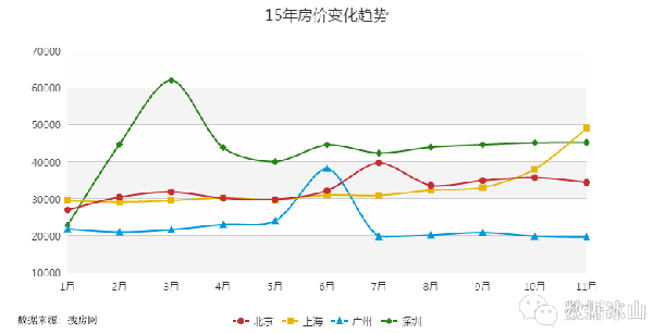 一谈到房子,作为在一线城市打拼的人来说满满都是泪。上图表示 15 年以来北上广深二手房的房价变化趋势。可以看到,深圳房价从今年 3 月份开始,以火箭般的速度异军突起,接连超越北京和上海,傲视群雄。北京和广州受到深圳房价的影响,在之后的二三个月内房价也相继上涨,随后又回落。上海的房价则是在 10 月份开始上涨,是否也会像另外三个城市那样 2 个月后回落呢?广州的房价和他的“衣食”指标相吻合,位列四个城市最低水平,看来最幸福一线城市桂冠属于广州人民啦!