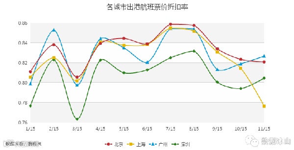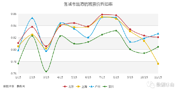 从 15 年以来北上广深机票折扣率分布可以看出,各地机票价格变化趋势基本一致,3 月份无疑是最划算出行的时间。深圳的机票折扣率远低于其他三个城市,从这点看来,深圳人民无疑是幸福的。