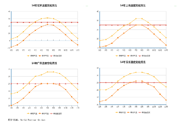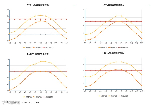 上图分别表示 14 年北上广深最低和最高温度的分布情况,同时我把最适宜人体的温度:25 度用红色横线标识出来。可以看到,红色横线落于最高和最低温度之间区域最多的城市是深圳和广州,而这两个城市最低气温常年均在 10 度以上,人们完全看不到雪花飘零,皑皑白雪的美景,对于喜欢冬天和下雪的朋友来说北京或许是最好的选择。相反,广州和深圳则是有大约 6 个月左右时间平均最高气温都在 30 度以上,桑拿天或许这又是北方城市无法体会的。