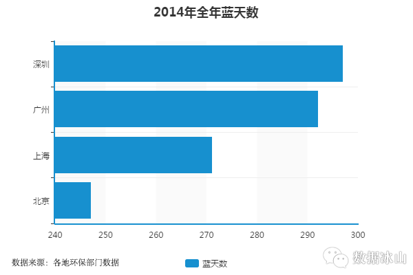 蓝天数近年来成为了衡量一个城市空气质量好坏的指标,可以看到,作为南方海边城市的深圳遥遥领先于其他几个城市,或许选择深圳作为养老的地方是个不错的选择。