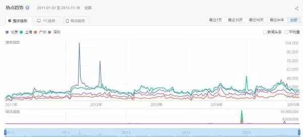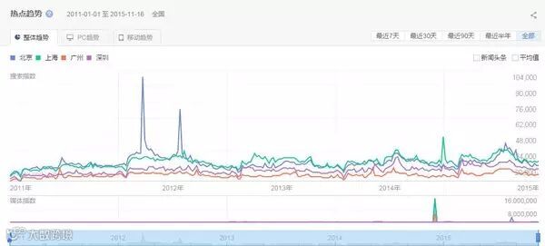 首先通过百度指数来衡量四个城市的热度,可以看到北京和上海城市热度难分伯仲,牢牢占据前两位。深圳和广州热度在 12 年以前相互交替,12 年以后,深圳已经完全超越了广州,近年来大有赶超北京和上海之势。至于北京峰值最高的那个点的缘由,时间 2012 年 3 月 20 日左右,大家脑补。