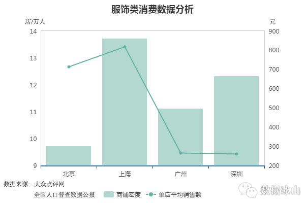 一座城市的购物便捷度往往也是城市魅力的表现形式之一,种类繁多的服饰以及低廉的价格通常更能俘获城市居民的芳心。我们根据公式 商铺密度=(综合商场数+各类服饰店面数+品牌折扣店数)/城市常住人口数 统计出居民购买服饰的便捷程度。从上图我们可以看到,上海购买服饰最便捷,而购买的均价也较高。广州和深圳购买的价格较为低廉,这也跟广州和深圳作为全国最大的服装批发聚集地的身份相吻合。