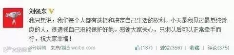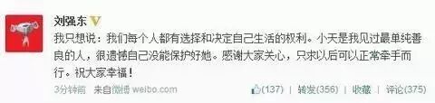 这份相差19岁的恋情在开始曝光时招来非议,网友在两人微博中的评论也越来越犀利。2015年1月13日,章泽天把所有微博内容都删掉,只留下一条微博并从此停更,其中写道:“好像无论我做什么,怎么做,甚至不做,都是错,所以今天我打破自己建立的保护圈,维护我作为成年人最基本的权力,期待属于我,一个21岁女孩的正常生活”。刘强东也站出来维护心上人:“小天是我见过最单纯善良的人,很遗憾自己没能保护好她。”