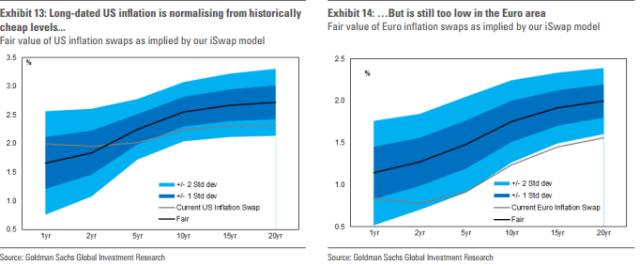高盛认为,欧美通胀明年都将上升,因此建议做多美国10年期通胀保值债券的“盈亏平衡”通胀水平,起始点位为1.90%,目标位2.30%,止损位为1.60%。对于欧洲,其实水平为1.25%,目标位1.60%,止损位为1.00%。