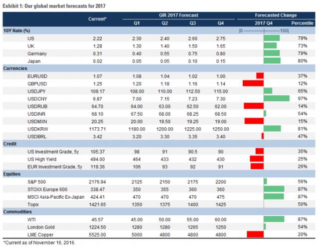 预测团队称,相对于他们去年对2016年的预测,明年持有金融资产的投资者可以预期更多回报——不过他们也强调,明年的回报也还是不会太高。“全球股市我们最看好亚洲各国市场(除日本外),我们预测其回报率能达到12.5%(2016年回报率为3.8%)。”分析师们在报告中写道,“我们预测日本东证股价指数会下跌3.7%(2016年上涨5.2%)。”