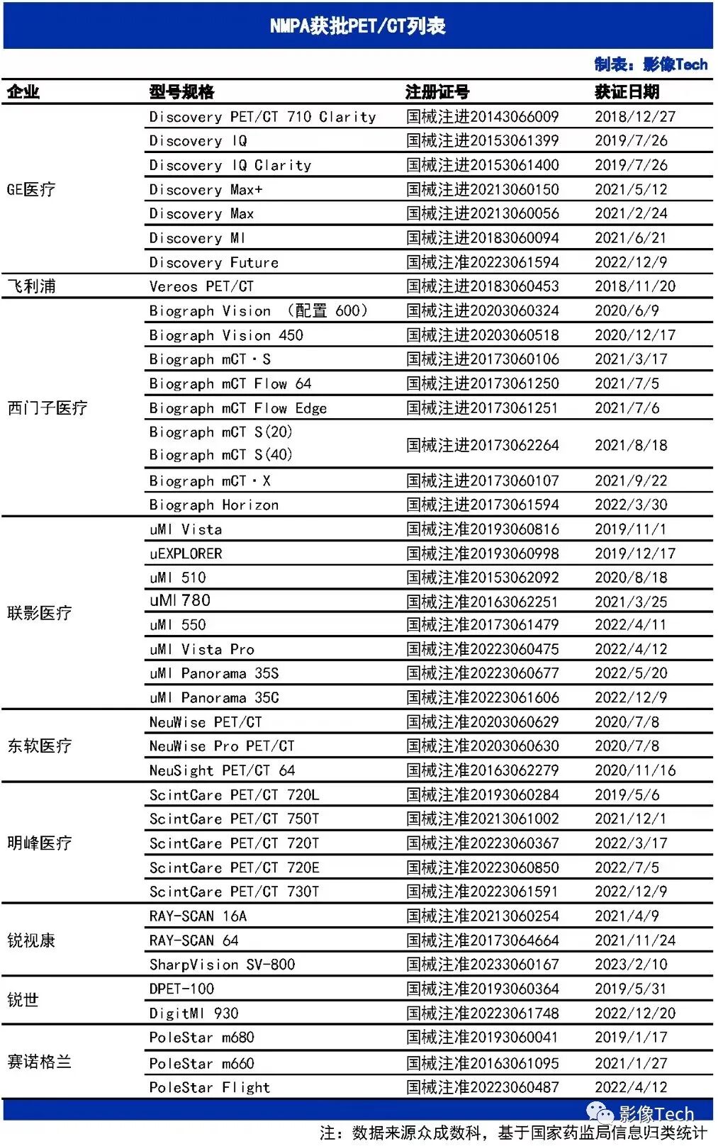 2018年3月16日,西门子医疗在法兰克福证券交易所上市。经过长期合作,Siemens Healthineers 和 Varian Medical Systems 于 2021 年 4 月合并。截至目前,西门子医疗有8款PET/CT注册证在有效期。