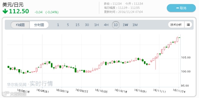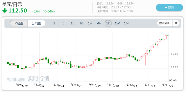 截至北京时间24日7:00,美元兑日元汇率上涨到了112.50,自特朗普当选总统以来,已经贬值6.52%。
