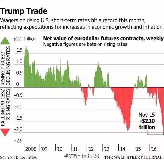 据华尔街日报中文网11月23日报道, 投资者在欧洲美元期货市场上对美国短期利率上升的押注上周触及历史最高水平,达到2.1万亿美元,打破了2014年创下的前纪录高位。一些分析人士称,追捧热门交易存在风险,一旦出现变数,可能引发巨大损失。