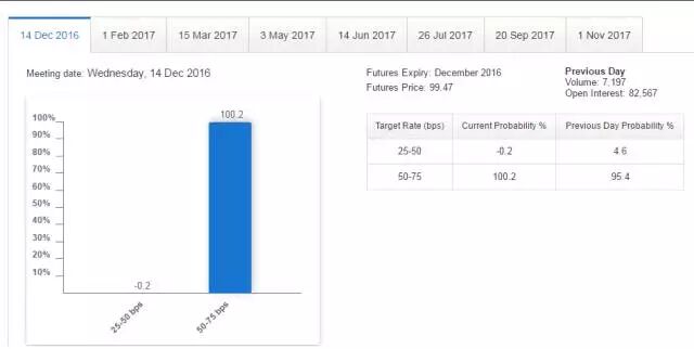 北京时间11月22日晚间,芝加哥商业交易所数据显示,预计美联储12月加息的概率一度上升到了100.2%。虽然北京时间11月23日早上,该概率回落至93.5%,但强烈的加息预期已成事实。
