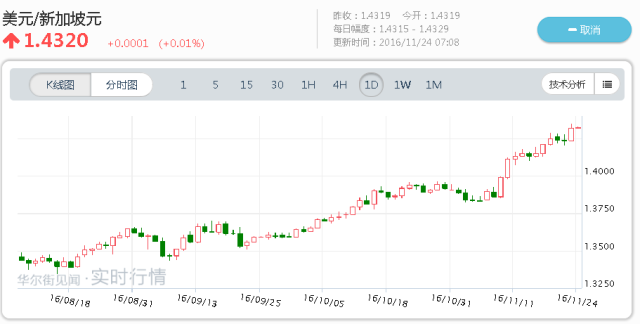 截至北京时间24日7:00,美元新加坡元汇率上涨到1.4320,从11月8日收盘1.3865算起,贬值3.28%。