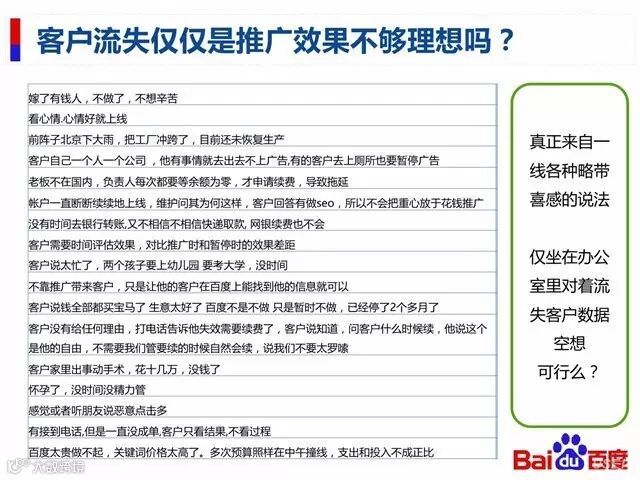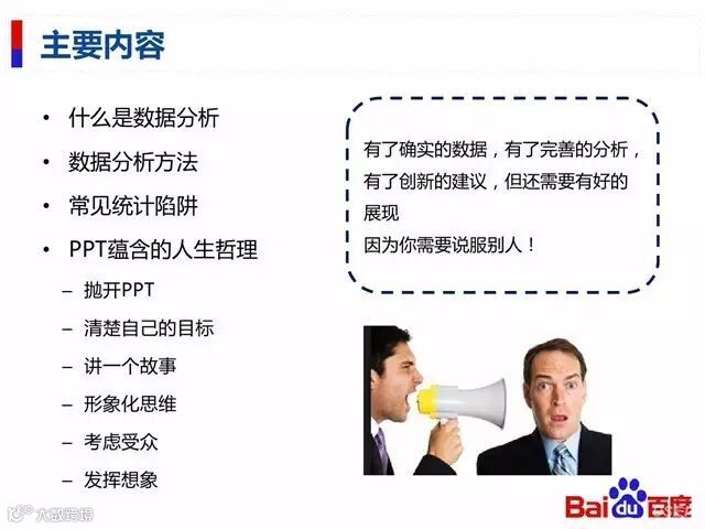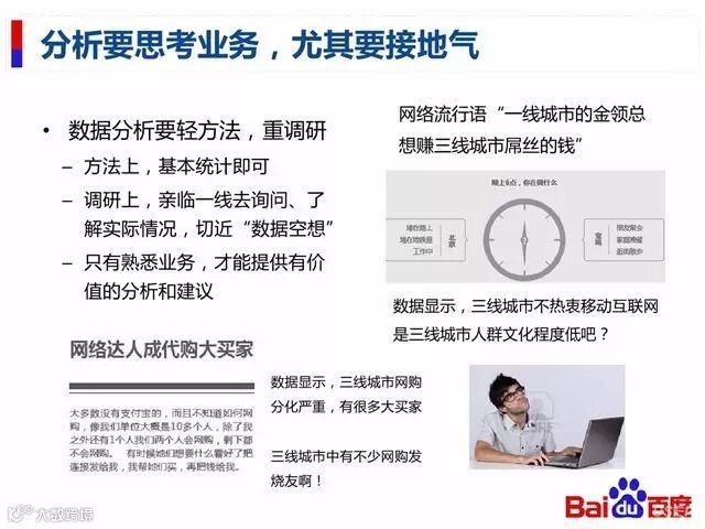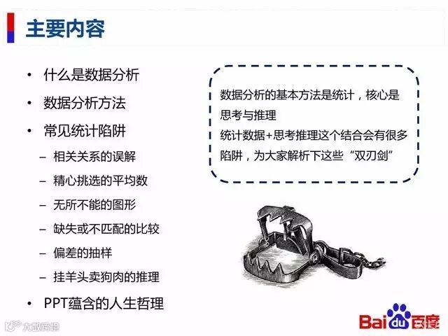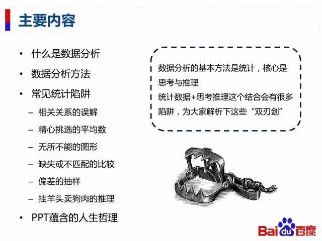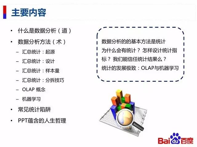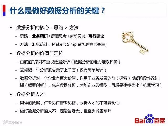 这是一个来自百度内部培训关于数据分析的、阅读类的PPT,文字说明非常充分,适合刚入门数据分析的朋友进行学习。