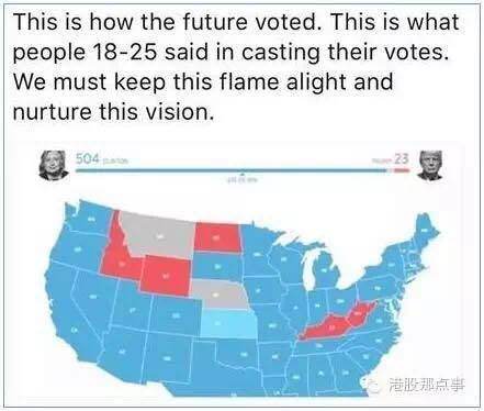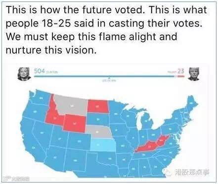 这张图是说,如果只统计18岁到25岁这个年龄群的投票,那么希拉里是以504VS23的绝对优势胜出。我明白了一个道理,你看为什么主流包括我说的社交网络,因为我们社交网络做一个调查,一般的信息是愿意表达意见的那部分人的信息,所以这个调查大部分是错的。如果你从哪里听到哪个媒体在网络上做的调查达到了百分之八十多,我认为大部分是错的,因为那个只是代表那帮愿意表达意见的人的观点。 所以在美国18到25岁几乎全部是支持希拉里的,就是压倒性的赢了川普,于是就会形成社交媒体都认为希拉里是会赢的,但是最后才知道是错的。因为中西部的那些中老年人根本不表达意见,也不参与调查。英国的脱欧也是一样的道理,当时主流的媒体都报道不赞成脱欧,因为都是年轻人在表达意见,那些老年人都是沉默的。 这也是非常悲哀的事情,悲哀在哪里,所有的重大的决策其实都是为了年轻人,但投票结果都是由老年人来决定年轻人的未来。