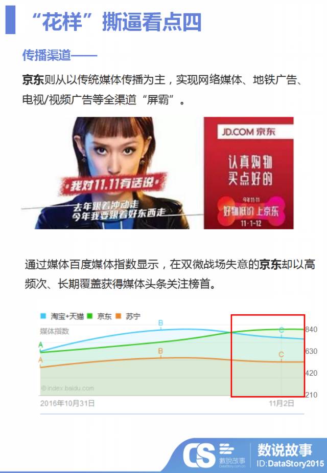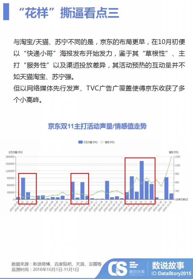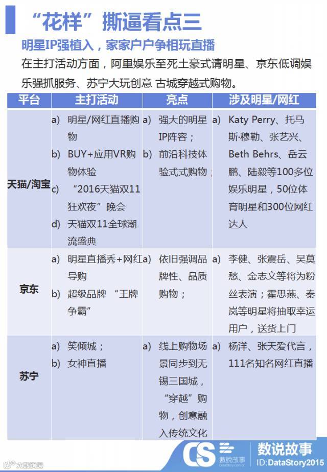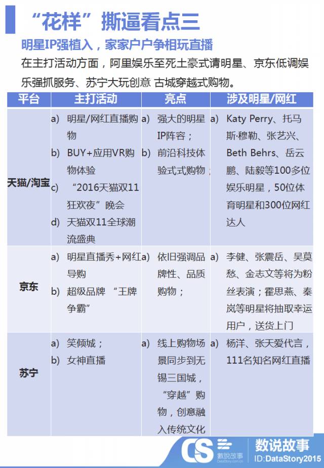 通过上文对阿里系、京东、苏宁的双11营销对比我们不难发现,电商造节营销已经全面从“比价”过度到“比质”的阶段,这里的“质”并不单纯的是只销售产品的质量,更是指消费者的购物体验。