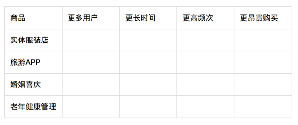 换言之,如果商业想要发展,就需要往四种方向中的一种或两种靠拢。所谓的产品定位,我更喜欢抽象理解成聚焦在四个维度上。是定位在更多用户,还是更长久的时间?