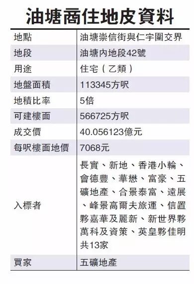 内房进军本港地产发展市场又多一员猛将。属市区临海地段的油塘商住地皮,在有多家内房参与争逐下,最终由央企五矿集团旗下的五矿地产(00230),以超出市场预期上限逾四成的40多亿元夺标,每呎楼面地价超过7000元。五矿指公司实现“走出去”的第一步,项目总投资达70亿元。