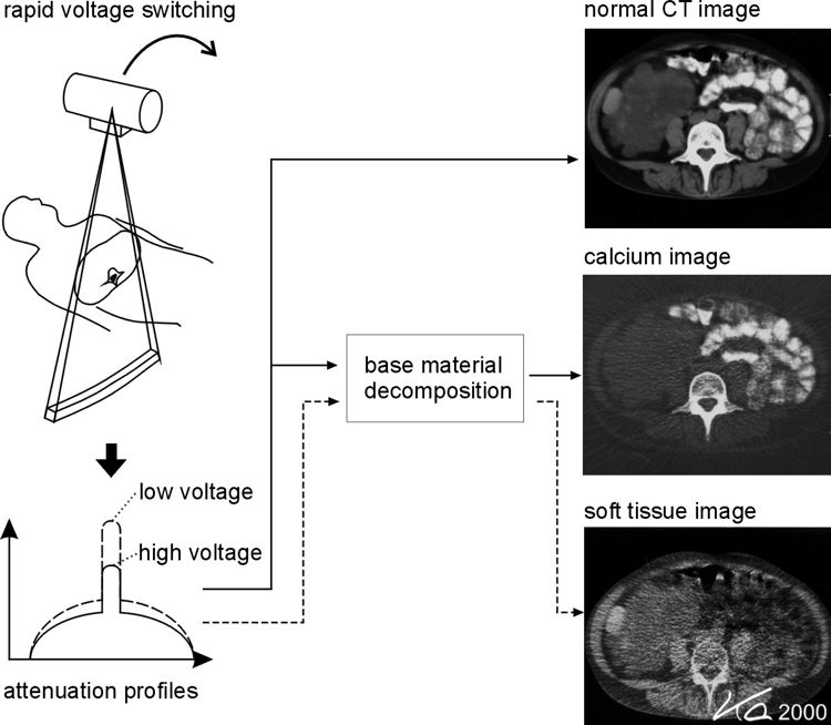 双能量方法可用于获得人体组织内有关物质组成成分的信息。使用两种不同的X线光谱,即使用不同的高压或不同的过滤器进行扫描。扫描时要经过两次连续的扫描或在两个投影之间快速切换高压。人体中最精密的数据处理方法是对测量数据的基本物质分析。