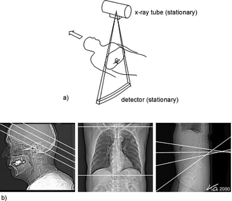 X线球管在一固定位置保持不动,病人平移通过测量野,扫描数字化的定位片(a)。定位片的剂量低,空间分辨率低。其投影方向原则上可以是任意方向。如图(b)所示,在定位片上可以选择单层扫描或整个扫描区域的位置和机架的倾斜角度。