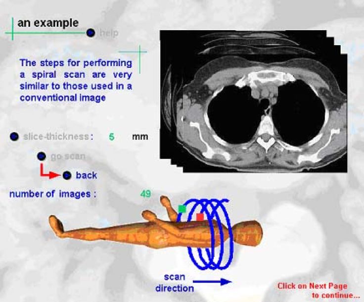 二十多年以来,CT检查都是连续的单层扫描。一般来讲,指的是360度扫描;但也可能是180度局部扫描(第1代和第2代CT的平行线束)或常用的240度局部扫描(180度加上扇形束的扇形角)。当扫描一个层面之后,病人平移一个固定的距离或扫描层距,通常它等于层厚。然后扫描下一个层面并重复上述步骤。这种检查方式所需的时间相对较长,因为进床和呼吸命令都需要时间,目前大部分已经被螺旋CT所取代。使用这种连续扫描方式,完整的器官检查常常需要5~20分钟。
