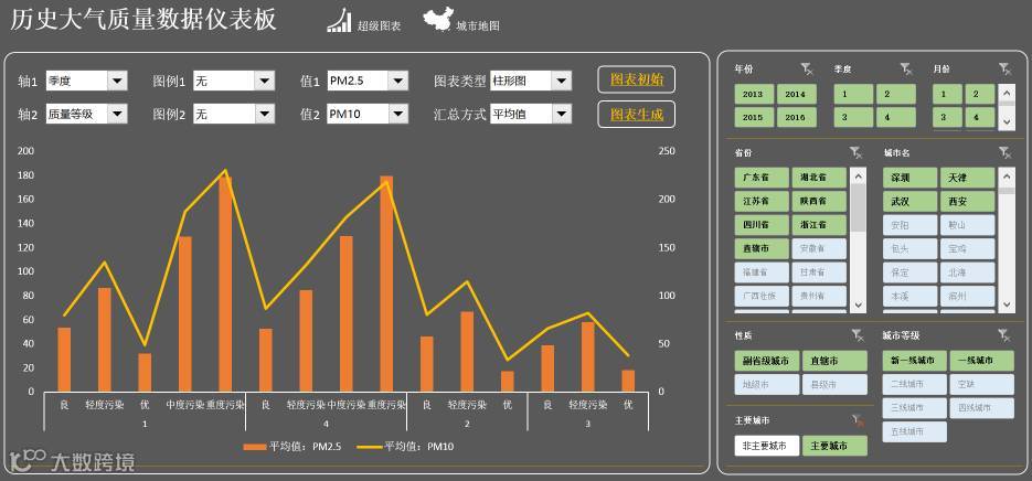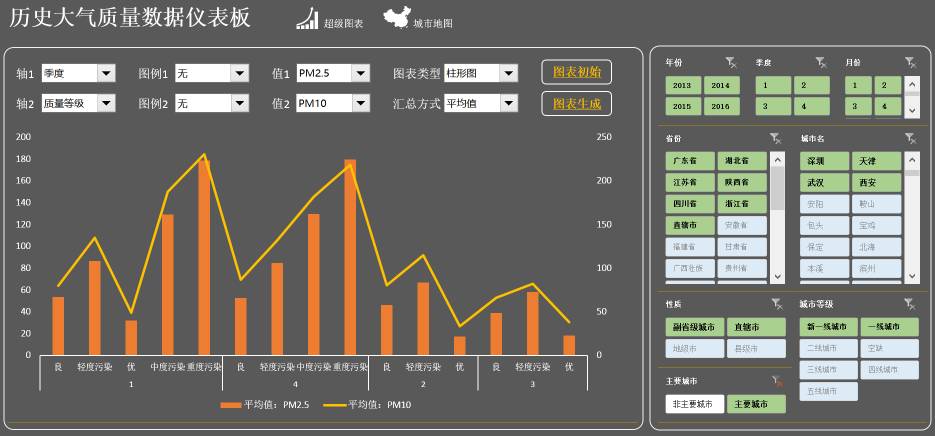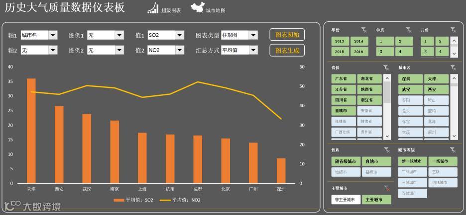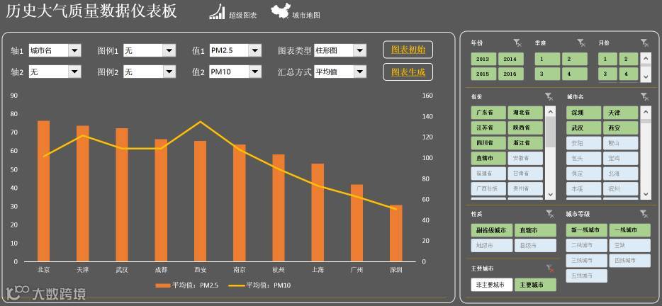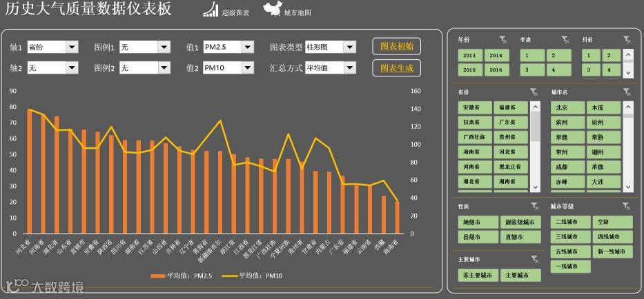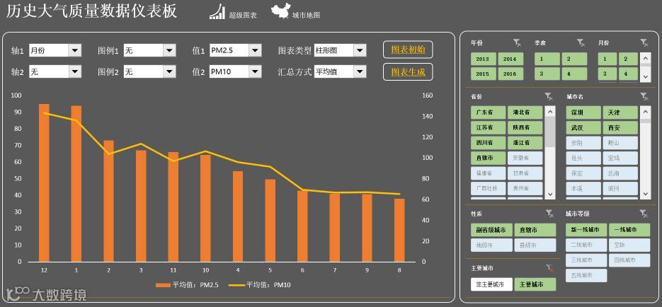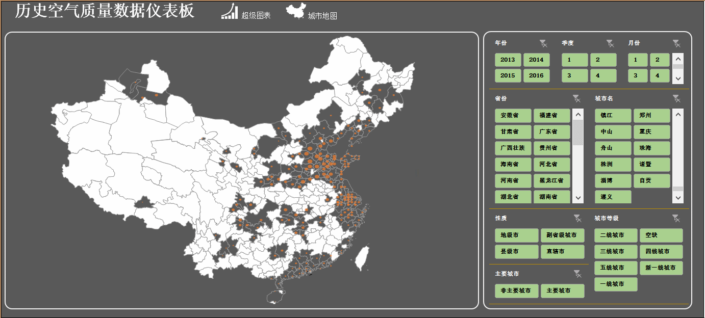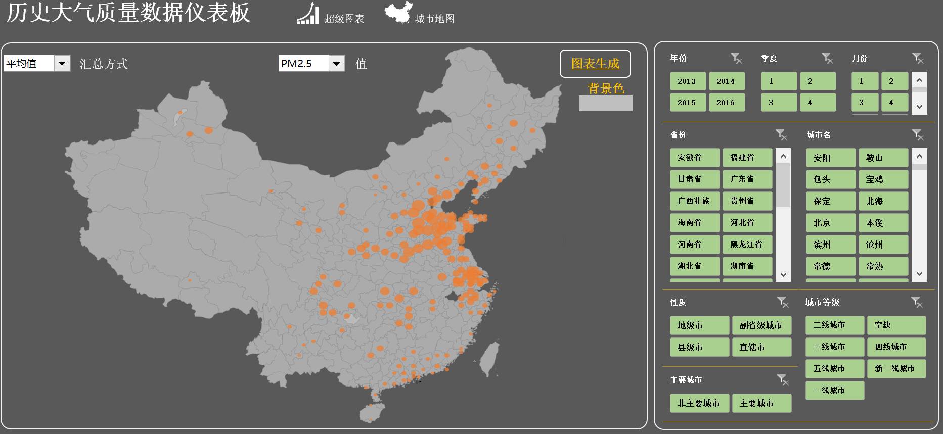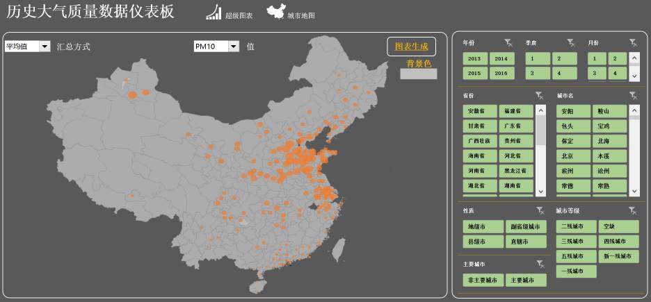 注: 文中使用数据均来自互联网,为各城市2013年12月到2016年9月统计的大气质量相关指标月平均值。数据内只包含有代表性的一些城市,没有覆盖全国,数据没有经过检验认证,不具备权威准确性,本文意在展现商业智能可视化手段能为我们提供什么样的数据信息,而非对大气质量的学术报告,请大家带着以上认知阅读本文。