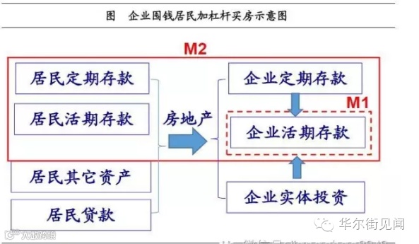 居民在拼命买房。居民面对不断降低的存款利率和理财收益率,再加上房价不断上涨带来的压力,被驱使进入房地产市场,将居民贷款转化为企业存款。其结果是企业存款高增,从而推高M1。而居民存款的持续低增则拉低了M2。