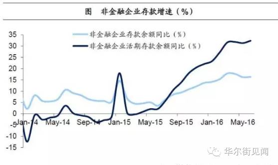 单位活期存款推升M1。货币剪刀差为何持续扩大?狭义货币M1由流通中的货币M0和单位活期存款构成。过去几年中,两者同步增长,在增速上并无显著差异。但15年初以来,M0基本维持在低位,而单位活期存款增速却从15年3月起一路走高,到16年7月已接近30%。显然,单位活期存款增速猛涨,是M1增速激增的主因。