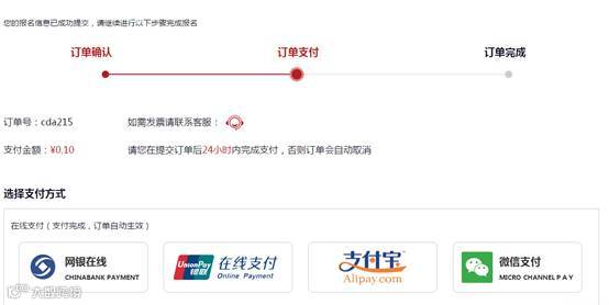 没有繁琐的支付流程,官网提交报名信息之后即可进入订单页面,订单支付界面可以选择微信、支付宝、银行卡、转账等多种方式。