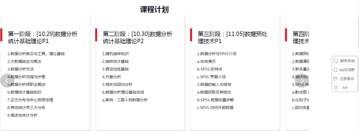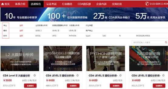 经过梳理和调整,新官网的选课界面按照维度分为专业、等级和软件三个方面,业务数据分析师、数据挖掘建模分析师、大数据分析师以及行业专题课程,类目清晰明了,同时学员们可以根据自己的需求选择适合自己的课程,再也不用担心选课选的眼花缭乱的问题了。