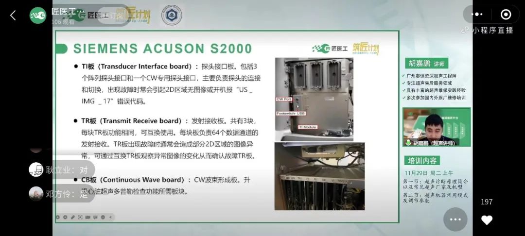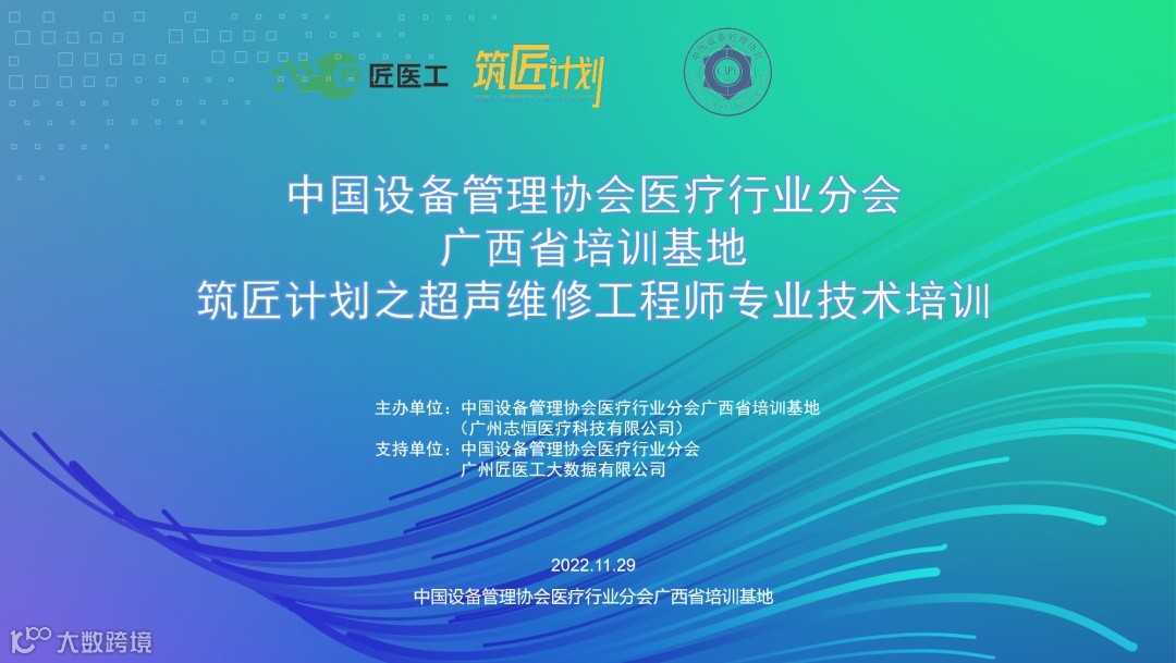 2022年11月29日,匠医工联合中国设备管理协会医疗行业分会广西培训基地,举办了第四期线上培训《筑匠计划之超声维修工程师专业技术培训》。