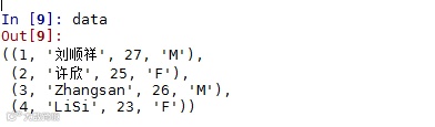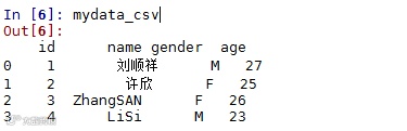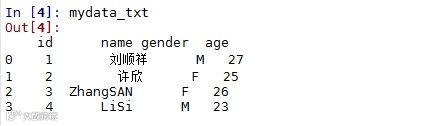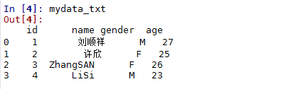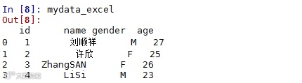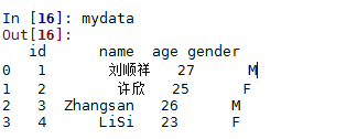 In [15]: mydata = pd.DataFrame(data, columns = ['id','name','age','gender'])