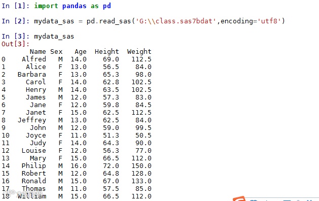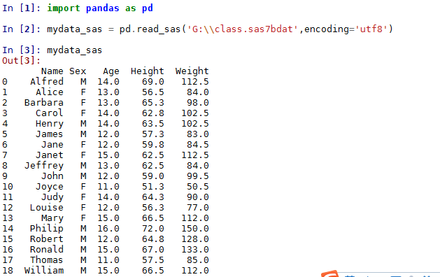In [2]: mydata_sas = pd.read_sas('G:\\class.sas7bdat',encoding='utf8')