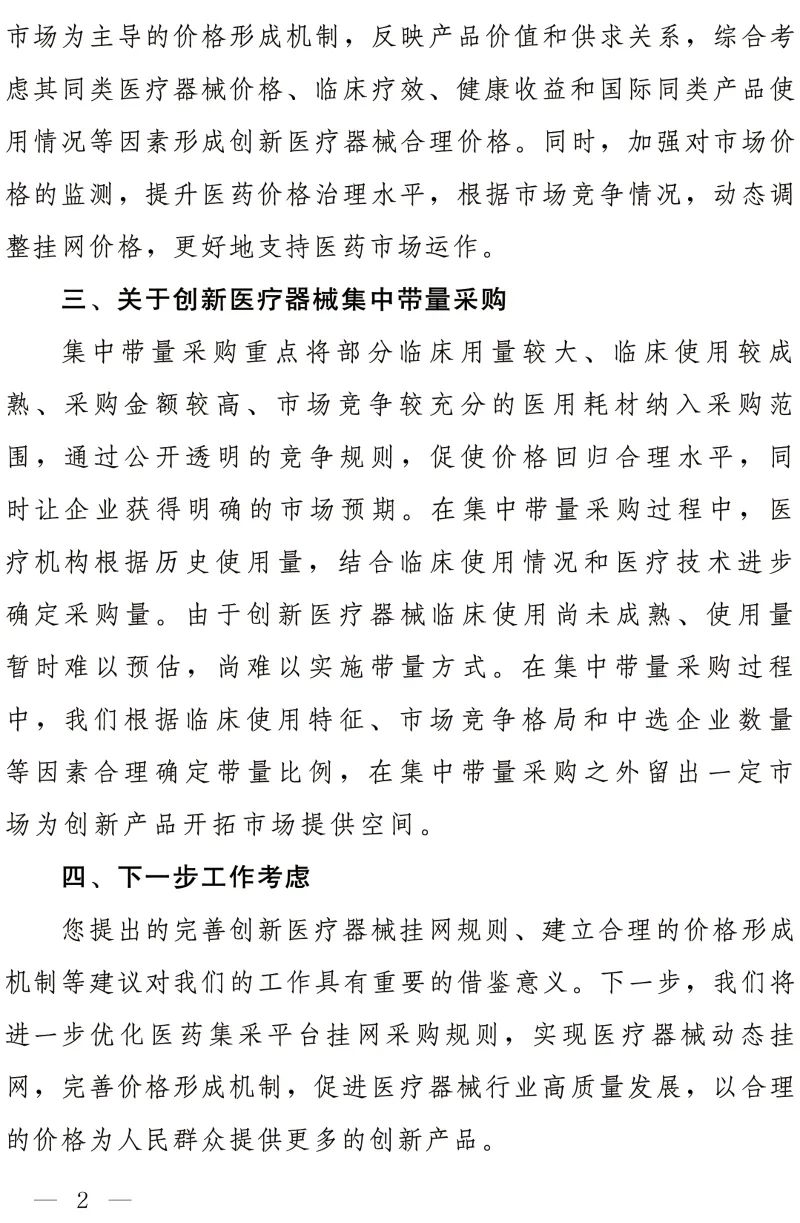 据《答复》披露,集中带量采购重点将部分临床用量大、临床使用较成熟、采购金额较高、市场竞争较充分的医用耗材纳入集采范围,通过公开透明的竞争规则,促使价格回归合理水平,同时让企业获得明确的市场预期。在集中带量采购过程中,医疗机构根据历史使用量,结合临床使用情况和医疗技术进步确定采购量。由于创新医疗器械临床使用尚未成熟、使用量暂时难以预估,尚难以实施带量方式。在集中带量采购过程中,国家医保局会根据临床使用特征、市场竞争格局和中选企业数量等因素合理确定带量比例,在集中带量采购之外留出一定市场为创新产品开拓市场提供空间。