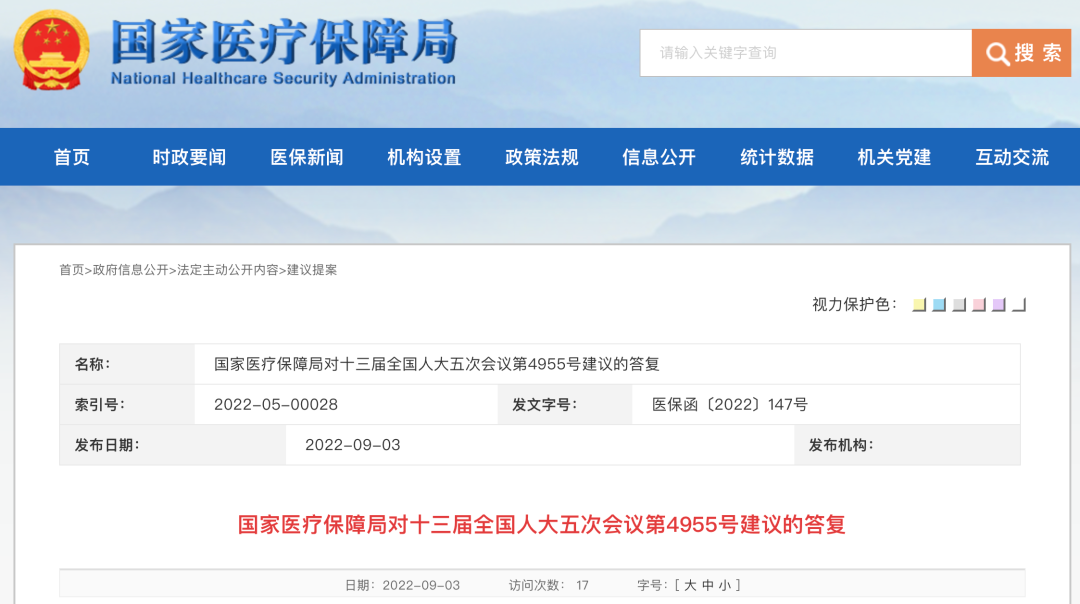 ▲《国家医疗保障局对十三届全国人大五次会议第4955号建议的答复》