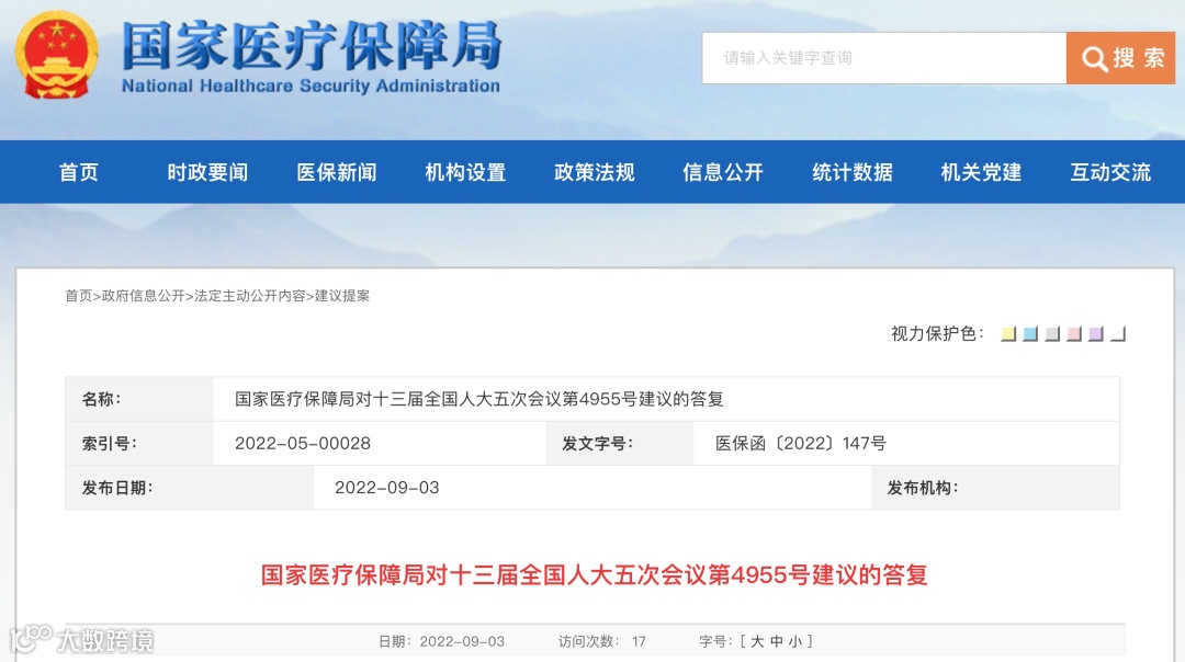本次报告为9月3日所发,国家医疗保障局对外发布《国家医疗保障局对十三届全国人大五次会议第4955号建议的答复》(以下简称“《答复》”)。