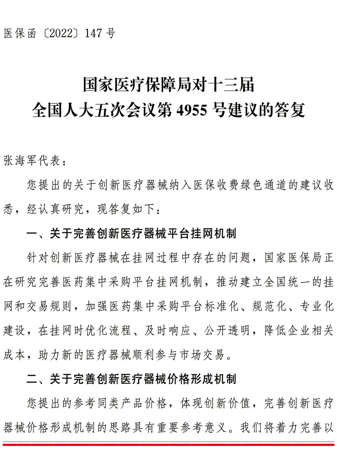 以下为《国家医疗保障局对十三届全国人大五次会议第4955号建议的答复》全文: