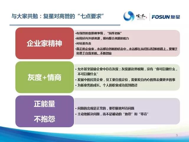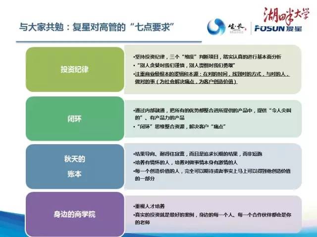 对于一个像复星这样的大企业来说,管理和执行力可能是最为重要的。复星对高管的七点要求: