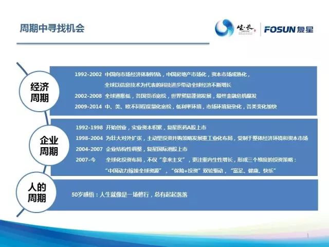 我们一定不能随大流、随概念,我们要坚持一个原则,不管上市还是不上市,一定要看对他基本面的分析。基本面没有问题,整个公司是好的,股价跌没什么好怕的;同样的,基本面没变化,股价涨了,还是那家公司。这种坚定,这种坚持,是我们复星能走到今天的原因。