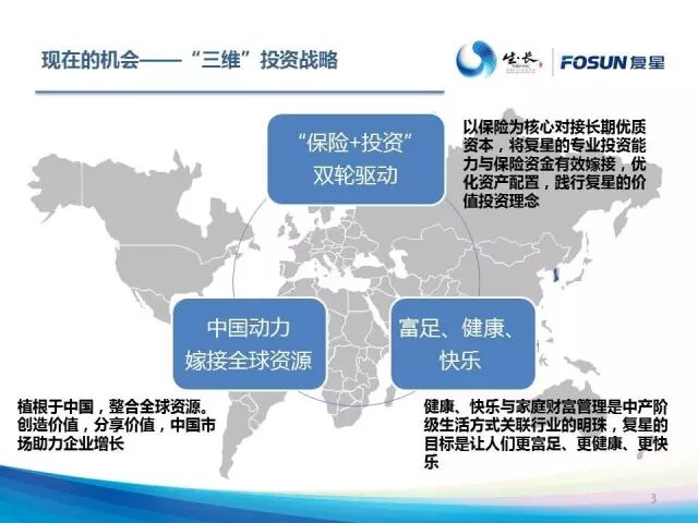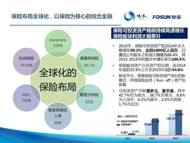 复星从咨询调查公司开始做起,涉足房地产和医药行业之后迅速做大,现在已经成为横跨多个行业的国际投资集团。复星现在的定位对标巴菲特模式。郭广昌认为,学习巴菲特关键有两点,第一,要建立起一个足够大的保险公司来支持集团的投资,因为保险资金量大而且成本低;第二,要坚持有纪律、长期的价值投资。