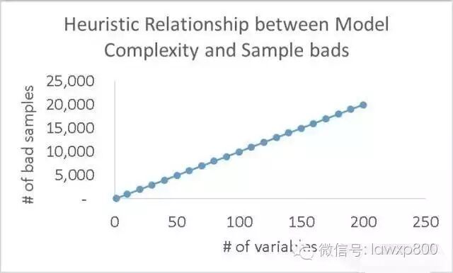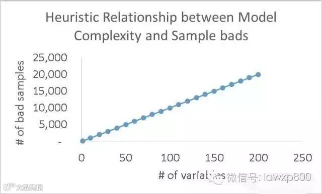 退一步说,就算我们事先知道应该用什么样的x,样本特别是坏样本的积累也是很难绕过的。了解建模的同学知道,越是复杂的模型(比如更多的变量),对于坏样本(y=1)数量的要求也更高。如下图所示,一般每增加一个模型字段,我们需要相匹配地增加至少100个y=1的样本。