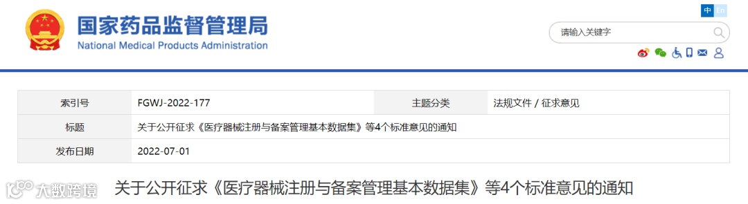 关于公开征求《医疗器械注册与备案管理基本数据集》等4个标准意见的通知