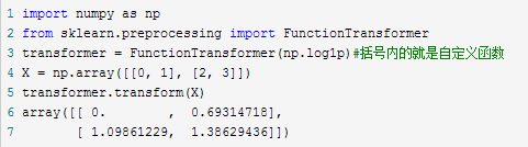 如果以上的方法觉得都不够,譬如你想用对数据取对数,可以自己用 FunctionTransformer自定义一个转化器,并且可以在Pipeline中使用